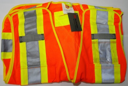 Polyester mesh, trimmed with black fabric 5-point tear-away, 2″ wide 3M Scotchlite silver on 4″ tape “X” on back, 2-vertical stripes on the front, 1 horizontal stripe around waist, 1 clear pocket on left chest, 2 chest pockets.